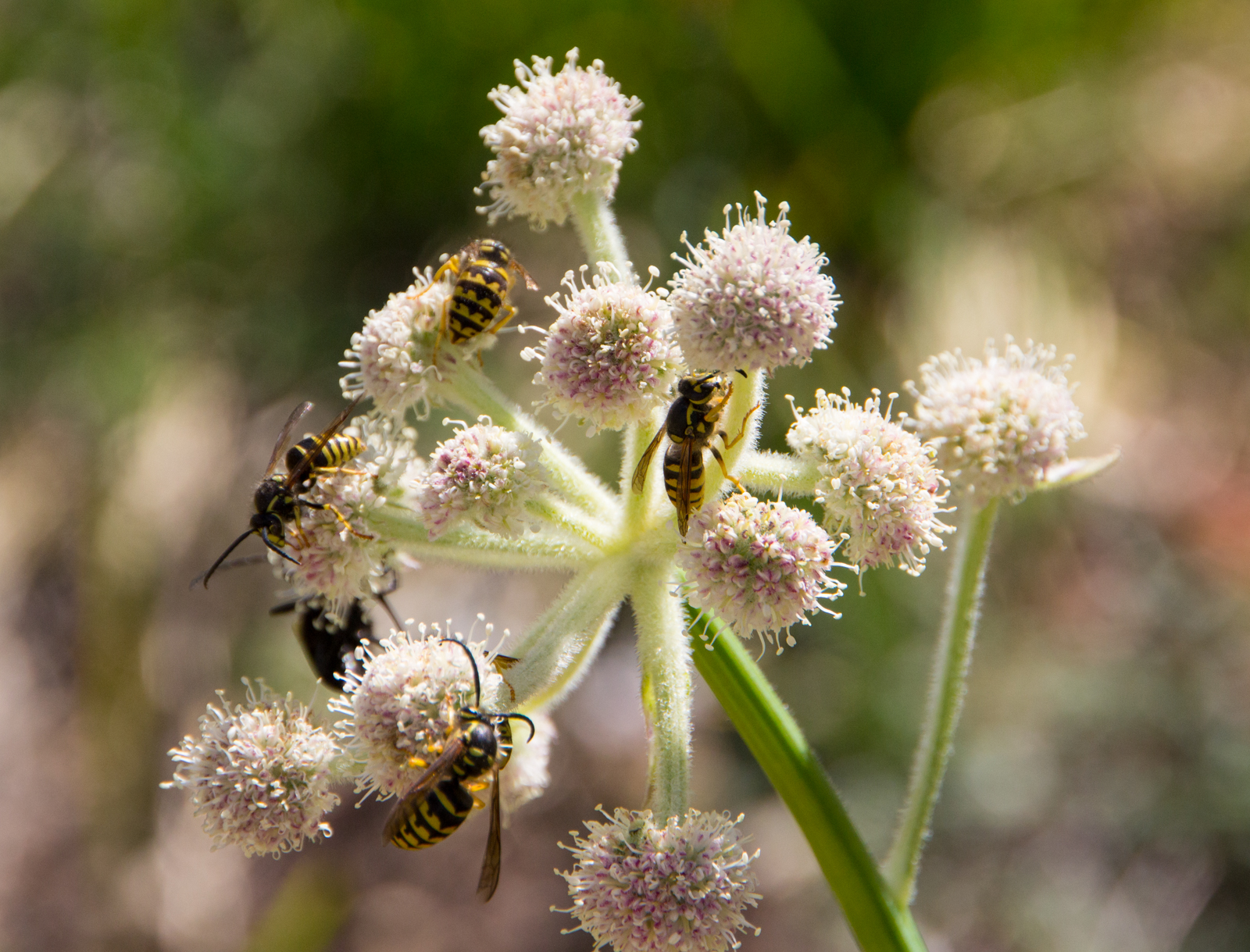 20170827_028 Published October 28, 2017 at 1600 × 1219 Pennsylvania yellowjackets (Vespula pensylvanica) feeding on Ranger’s buttons (Sphenosciadium capitellatum)
