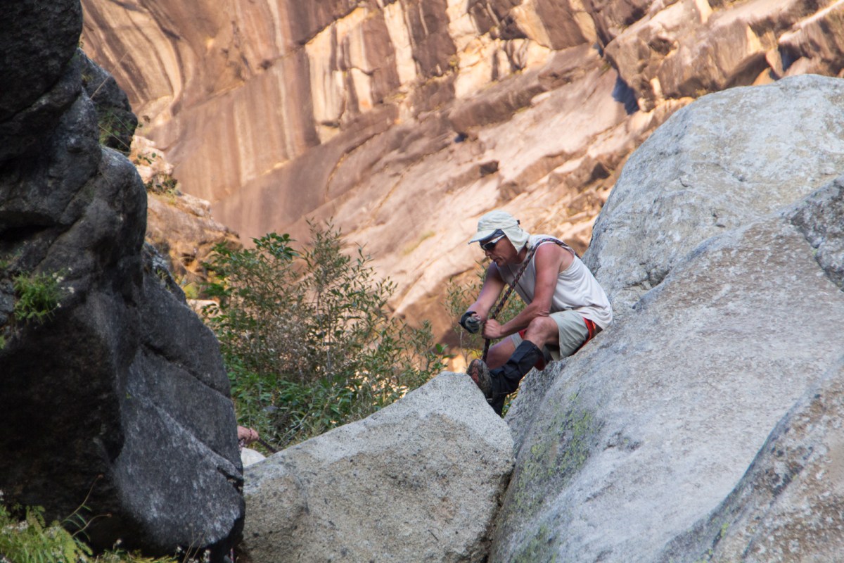 Tony guiding Ken down a boulder constriction Published November 1, 2017 at 1600 × 1067 Tony guiding Ken down a boulder constriction